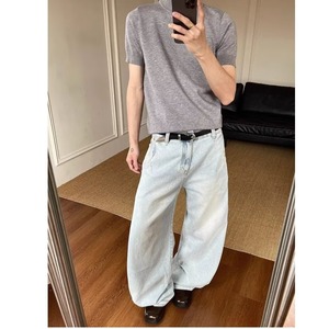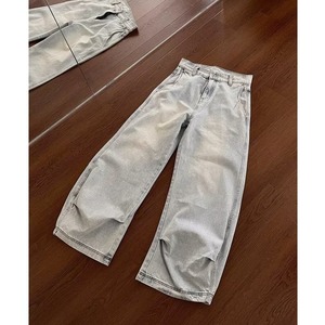 2025 夏ライトブループリーツカーブスモールジャンジーンズアメリカンハイストリートルーズストレートワイドレッグドレープパンツ