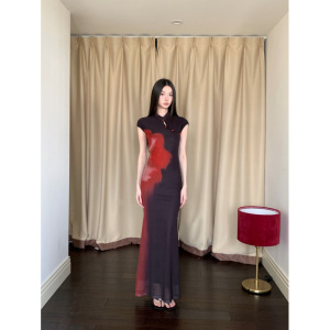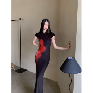 リアルショットスポット新中国風黒と赤のコントラストプリントウエストカバーヒップチャイナドレス