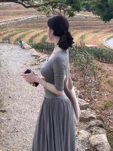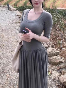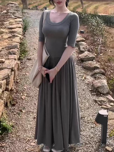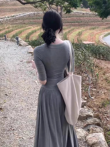 バレエスタイルグレー半袖ドレス女性のための夏の2025新しいデザインウエストと美しいプリーツロングスカート