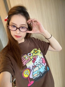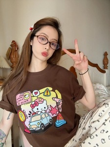 コットンダークカラー多用途ピュアコットン半袖Tシャツレディースキャンパスハローキティプリント半袖Tシャツトップスメンズ