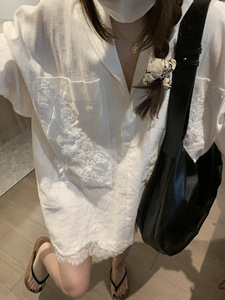 ホワイトVネックポケットデザインスリム長袖ラミーシャツスカートオールドマネースタイルレイジーリラックスドレスショートスカート