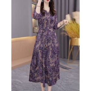 夏のママの花柄プリントの新しいファッションドレス2025は、肉をカバーし、ウエストを細くし、スリムでエレガントな薄いスカートです。