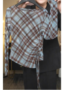 一字领轻薄透气侧边抽绳网纱T恤女夏季气质小众设计格子防晒罩衫