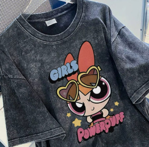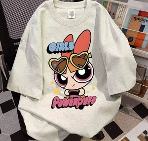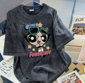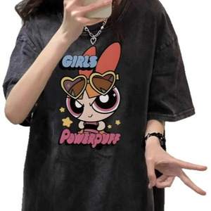 パワーパフガールズ 2025 新しい夏ルーズカジュアルウォッシュブラックアメリカンプリント漫画イン半袖 T シャツ