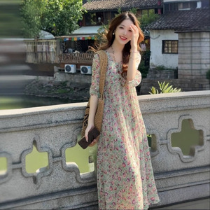 Bbfs 6862緑の花のシフォンのワンピースの女性2025夏の新型の高級感のフランスのお茶の休みのスカート