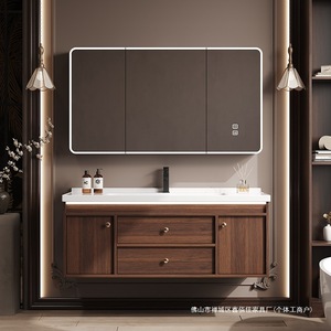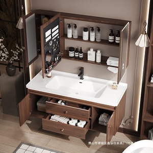 新しい中世スタイルのクルミ材のバスルームキャビネット組み合わせバスルームセラミック一体型洗面台洗面台カウンター