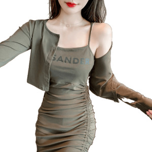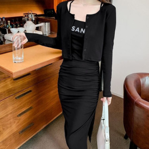2025 新しい長袖カーディガン + レタープリントスリム巾着スリットサスペンダードレスツーピースセット女性のための