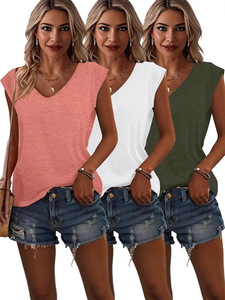 2025欧米の国境を越えたアマゾン速売通の3つの服装女装シンプルな純色vネックカバー袖ゆるいtシャツ女性