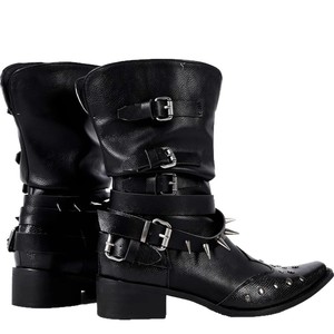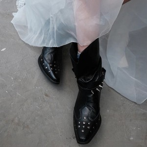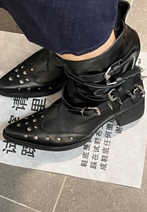 黒のレトロなリベットナイトブーツポインテッドトゥウエスタンカウボーイブーツ女性のための 2025 春と秋の新しい厚いヒールスリーブミッドカーフブーツ