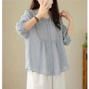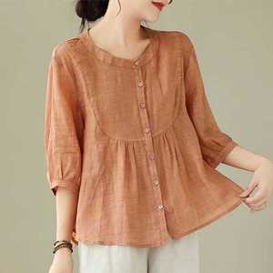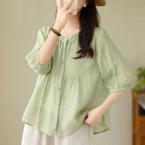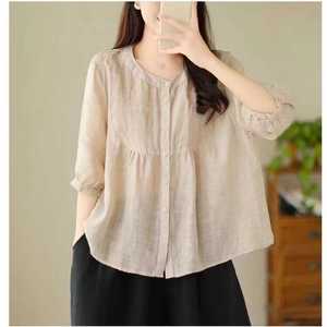 プラスサイズの女性の綿とリネンのシャツ半袖 Tシャツ夏の新しいお腹カバートップリネンマザーズルーズシャツ