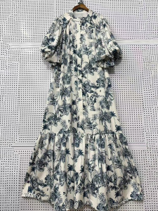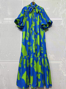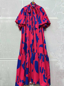 2025 越境貿易婦人服レトロ幾何学プリントプリーツシングルブレストレースアップドレス夏ルーズチュチュスカート