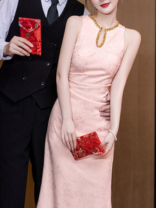現物現物新中国式チャイナドレス女性2025新高級感ピンク婚約ドレススカート気質優雅小衆