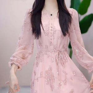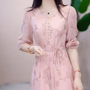 ピンク(ポケット付き高級ライトフェザーシルクスパンコール膝上ドレス)