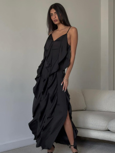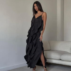 2025夏の新型ファッションハスの葉の縁のvネックのサスペンダーのフォークのワンピースの女性のデザイン感のファッションの気質の通勤