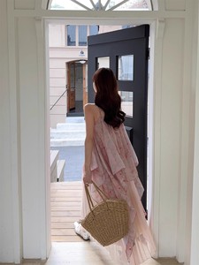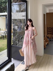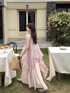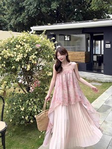 ピンクのデザイン不規則なシフォンプリントメッシュサスペンダーロングスカート新しいスタイルのスーパーフェアリービューティードレス妖精夏