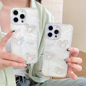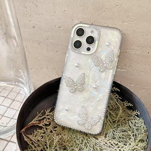 新型ラインストーン貝殻柄iPhone17Proスマホケース 立体パール蝶々付き Apple16耐衝撃保護カバー