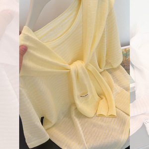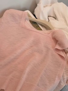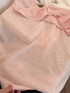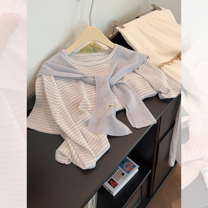 韓国系ピンクのストライプのニット半袖tシャツ女性の夏の薄いタイプの小さい子供のマントの上着の2つのセットの服