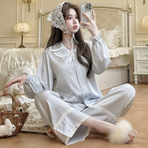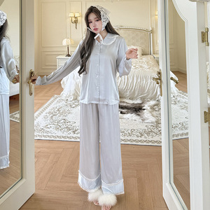 2025 新しい氷と雪のシルクパジャマ女性の長袖ズボンレースカジュアルフレンチホームウェアセットは屋外で着用できます