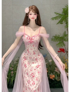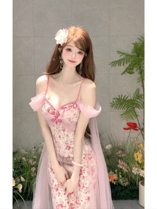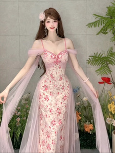 夏の純粋な欲望スタイルニッチ気質ウエスト妖精サスペンダースカート新しいメッシュデザインホリデードレスロングスカート