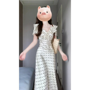 女性のためのフレンチポルカドットパフスリーブドレス、夏の海辺の休暇、優しいスタイル、ウエストを絞り、ユニークで美しい小さなスカート