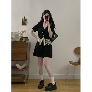 2025 新しい夏の大きいサイズのファッショナブルなデザインのスプライシングレースフェイクツーピーストップ + スカートツーピーススーツ