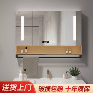 スマートバスルームミラーキャビネット、壁掛け式、ライト付き曇り止めバスルームドレッシングミラー、シンプルな無垢材、収納ラック付き