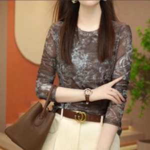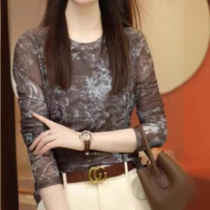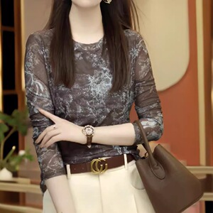 印花网纱打底小衫女长袖t恤春季新款高级感时尚洋气肌肤弹力上衣