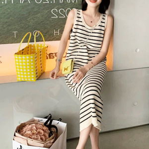 ニットドレス女性の夏のフレンチルーズロングノースリーブベストドレスカジュアルシーサイドホリデービーチドレス