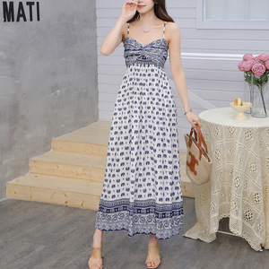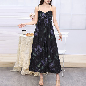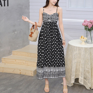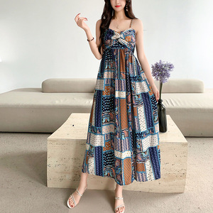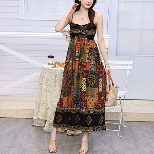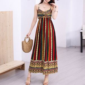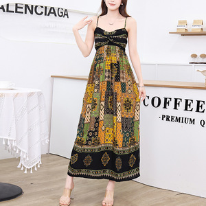 夏ボヘミアン花柄サスペンダースカート東南アジアレーヨンシルクスカートノースリーブプリント海辺休暇ロングスカート