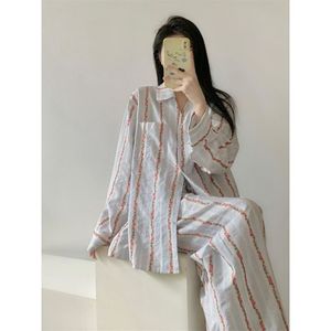 法式复古碎花条纹睡衣春秋女薄款高级感长袖长裤两件套大码套装