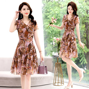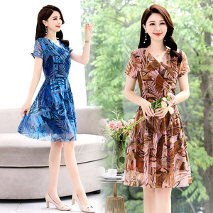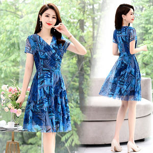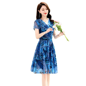 ブルーのVネックシルクミディ丈ワンピース 2025年夏新作 さわやかで甘いAラインワンピース 多重プリーツ入りスリムフィットプリントワンピース