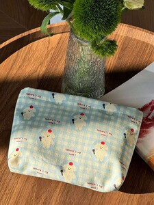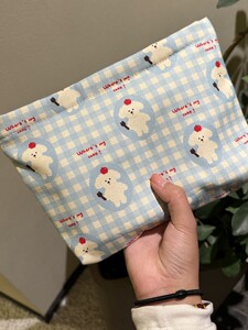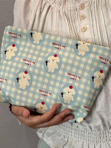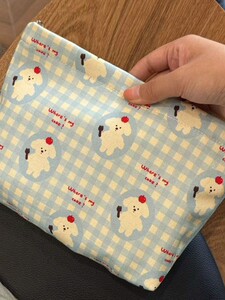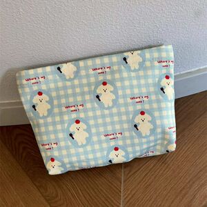 ブルーチェックの子犬用化粧品バッグ