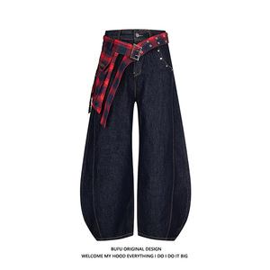 アメリカンハイストリートチェック柄デコンストラクトウォッシュジーンズ男性と女性のためのクリーンフィットワイドレッグカジュアルルーズトレンディなシミターパンツ