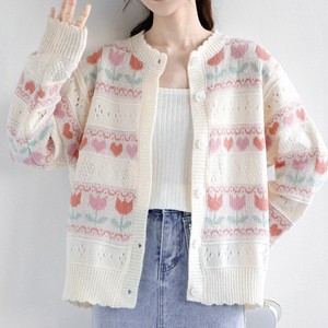 女性用の秋と冬のセータージャケット、甘くて新鮮で柔らかくワックスのようなレースの襟、コントラストのある小さな花の中空長袖ニットカーディガン