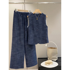オールドマネースタイルリラックスイミテーションリネンデニムスーツ女性の夏のレトロハイエンドノースリーブベストズボン通勤トレンド