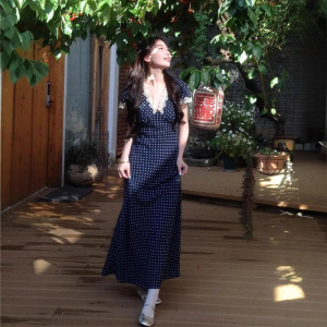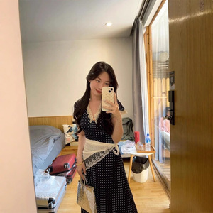 香港スタイルのレトロな気質 V ネック水玉ドレス女性の夏の新しいデザインニッチレーススプライシングロングスカート