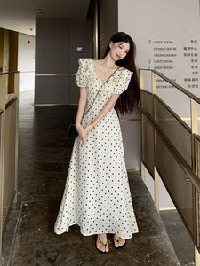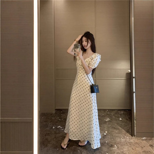 韓国パフスリーブ甘い水玉模様のドレス女性の夏の新しい気質ウエスト痩身蓮の葉の襟レースアップロングスカート