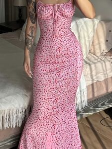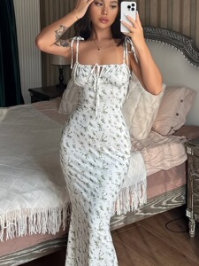 欧米の国境を越えたアマゾンの新しい花のプリントのストラップの優雅なU字の襟のノースリーブの露背のワンピース2025夏