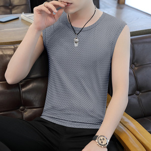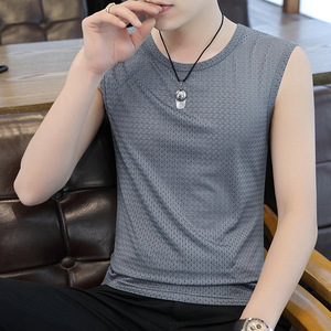 メッシュ通気性アイスシルクメンズベストトレンディなラウンドネックベストシームレスタイトスポーツノースリーブトップ夏