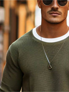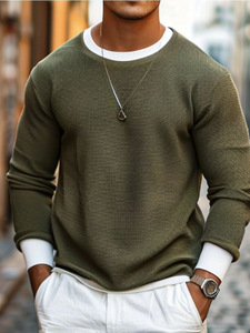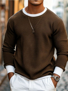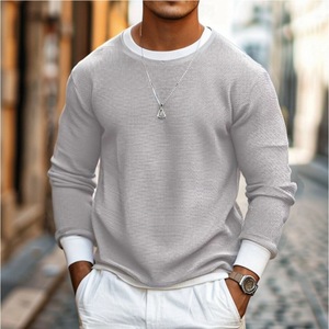 2025 春と秋のアマゾン人気メンズカジュアル T シャツワッフルカラーブロックダブルラウンドネックルーズで多用途な長袖
