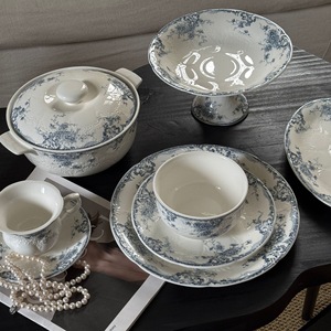 复古法式浮雕蕾丝纯白花边青花陶瓷餐盘碗杯高脚盘重工系列批发