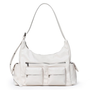 ホワイトのモーターサイクルバッグ、羊皮の質感