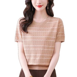 2025 新しい半袖 Tシャツルーズ痩身西洋スタイルママシャツ女性の夏のストライプジャカードアイスシルクセーター