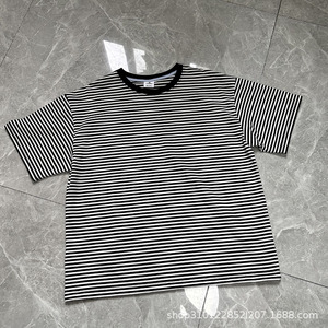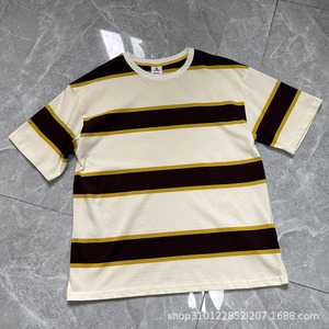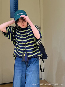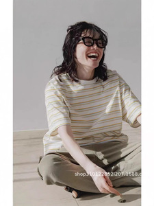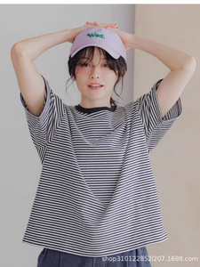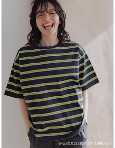 2025 新しい夏の日本のニコ半袖コントラストストライプカジュアルシンプルな年齢軽減ルーズラウンドネック Tシャツ女性用