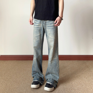 夏のアメリカンスタイルのハイストリート、ややフレアなデニムパンツ、スリムフィットのストレートロングパンツ