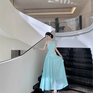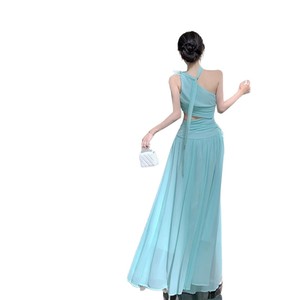 リアルショットスポットビーチドレスレディース夏気質斜め肩バックレスノースリーブドレス海辺休暇妖精シフォンロングドレス