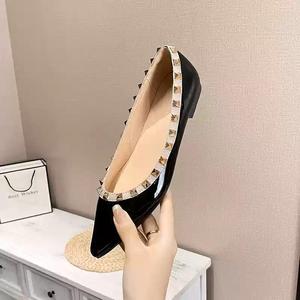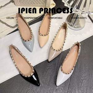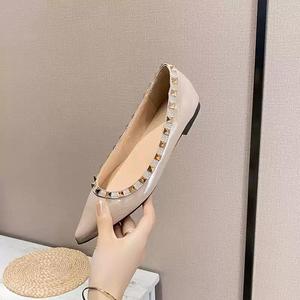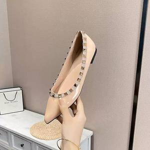リベット付きヌードカラーの尖ったつま先のソフトパテントレザーのフレンチスタイルの女性用シングルシューズ、春の新作、ファッショナブルで多用途な通勤靴