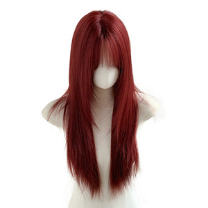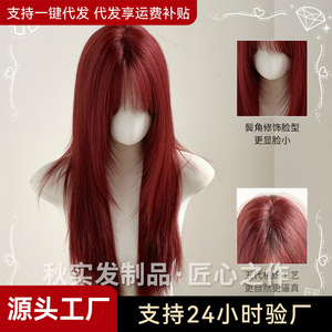 Qiushi ウィッグ ラズベリー レッド シャープ バング ロング ストレート ヘア スタイリング ハイレベル気質 ナチュラル フルヘッド カバー 卸売 クロスボーダー
