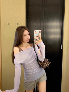 デザインホットガールフェイクツーピースメッシュ長袖Tシャツレディース夏薄い日焼け止めブラウス多用途オフショルダートップ