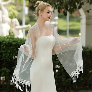 V1742 花嫁のウェディングドレスショールパールエレガント社交レースシンプルエクストラロングショール